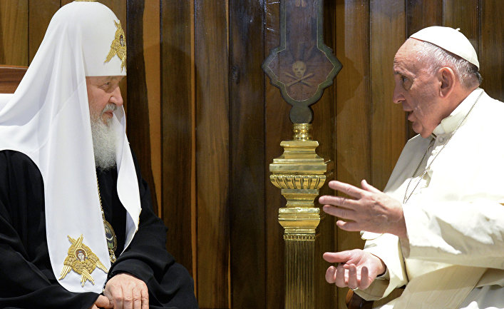 Но в пятницу днем в Международном аэропорту Хосе Марти разыгралась необычная сцена. Глава Римской католической церкви Папа Франциск и глава Русской православной церкви Патриарх Кирилл обнялись и поцеловались, а затем провели двухчасовые переговоры и опубликовали совместную декларацию из 30 пунктов, посвященную судьбе христианства в Европе, тяжелому положению христиан на Ближнем Востоке и историческому противостоянию церквей на Украине.