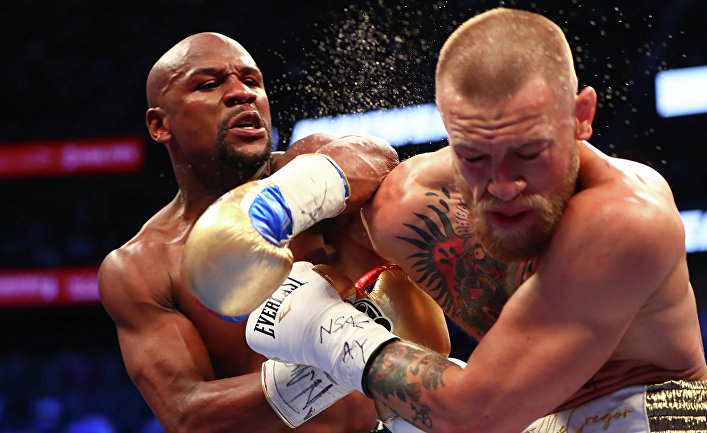 Возможно. Некоторые хотели, чтобы победил Мейвезер, другие надеялись, что Макгрегор, преодолев все невероятные препятствия, одержит победу, а были и такие, которые рассчитывали, что эти двое смогут послать друг друга в нокаут. У Мейвезера еще есть один послужной список: речь идет о его действиях криминального характера, связанных с избиениями женщин; тогда как Макгрегор продемонстрировал способность наносить вербальные удары ниже пояса, затрагивая такие темы, как расовые отношения, мизогиния, проблемы Мейвезера с чтением и тому подобное. Они устроили это представление в зале T-Mobile Arena в присутствии 14 623 фанатов, многие из которых были в модных костюмах и без носков, а многие женщины — в коктейльных платьях и на высоких каблуках, будто вырядились для какого-то яркого праздника. Там были знаменитости из списка А, знаменитости из списка Г, люди, которые сами считают себя знаменитостями, и толпы ирландцев, завернутых в национальные триколоры, а также группа молодых женщин в шортах, украшенных названиями тех компаний, для попадания на веб-сайт которых вы должны подтвердить свое совершеннолетие. Одним словом, там было много любителей бокса. Кроме того, там были и мы, остальные зрители, весь мир, так как наслаждаться этим поединком могли телезрители более 200 стран и территорий. Миллионы телезрителей были готовы заплатить за то, чтобы посмотреть этот кулачный деликатес.