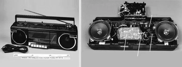 Слева тип магнитолы «Тошиба», в которую было установлено взрывное устройство, разрушившее самолет рейса 103 Pan-American. Справа реконструкция размещения блоков взрывного устройства внутри магнитолы.