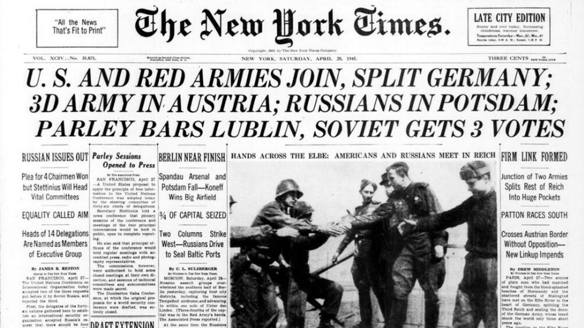 Блокпост Красной армии на Эльбе. 27 апреля 1945 года. Американские и советские войска встретились на Эльбе. Западный и Восточный фронты наконец-то встретились, а Германия разделена на две части. Первый контакт был установлен два дня назад – в 16:40, 25 апреля, патрулем из четырех человек 273-го полка 69-й пехотной дивизии и русским форпостом в городе Торгау, расположенном в 20 милях к западу от наших передовых сил.С американской стороны честь создания этого исторического воссоединения принадлежит Кортни Х. Ходжесу, генералу 1-й армии США, которая форсировала пляжи Нормандии в июне прошлого года и прошла 700 миль через Францию, Бельгию и Германию к этому месту. С российской стороны – маршалу Ивану С. Коневу, командующему войсками 1-го Украинского фронта, которые прошли путь в 1400 миль от Сталинграда в одном из величайших маршей против ожесточенного сопротивления за всю историю.Этот подвиг свершили войска американской группы армий под командованием генерала Омара Н. Брэдли, который возглавлял 1-ю армию в первые дни вторжения в Нормандию и признан теми, кто знаком с его службой, одним из величайших полевых командиров в мире, и 5-м корпусом, частью которого является 69-я пехотная дивизия под командованием генерал-майора Кларенса Р. Хюбнера, который привел 1-ю дивизию на пляж Нормандии и помог ей вклиниться в укрепленную линию Зигфрида. 69-я дивизия, которой командует генерал-майор Эмиль Ф. Рейнхардт из Декейтера (штат Джорджия), является одной из самых молодых в боевых действиях: она вступила в бой только 12 февраля. Она разделила недавнее взятие Лейпцига с нашей 2-й пехотной дивизией.Радостная встречаАтмосфера, в которой проходила встреча американских и советских войск и их местных командиров, была достойна великого события.Русские приняли нас с распростёртыми объятиями, и наши люди ответили им взаимностью. С того момента, как первый американский патруль был доставлен на советский передовой командный пункт, это была почти непрерывная вечеринка.Первые военнослужащие, установившие контакт, пожимали друг другу руки и хлопали по спине.Русские устраивали фронтовые банкеты с едой и водкой, а американцы – с бренди и шампанским, "освобожденными" из немецких армейских складов. Звучали тосты, песни и выражения надежды на будущее, в котором Америка, Россия и Британия будут вместе защищать прочный мир.Есть что-то родственное в душевном, несдержанном радушии русских, с которыми мы встречались последние три дня, и сердечном дружелюбии рядовых солдат. Наши солдаты и русские прекрасно ладят друг с другом. Отношение американцев к фронту можно подытожить фразой одного водителя джипа: "Эти русские – отличные ребята".Восторженное радушие между русскими и американскими солдатами продолжалось вплоть до череды встреч: полковника Чарльза М. Адамса, командира 273-го полка, с его русским коллегой; генерала Рейнхардта с командиром советской дивизии и генерала Хюбнера с командиром советского корпуса.Солдаты из Бронкса в группеКогда наши войска и русские встретились, это было в значительной степени случайностью – настолько случайностью, что произошла небольшая перестрелка, прежде чем группы, вступившие в контакт, убедились, что другие – друзья, а не немцы.Американский патруль, которому официально приписывают первую встречу, возглавлял молодой второй лейтенант Уиль