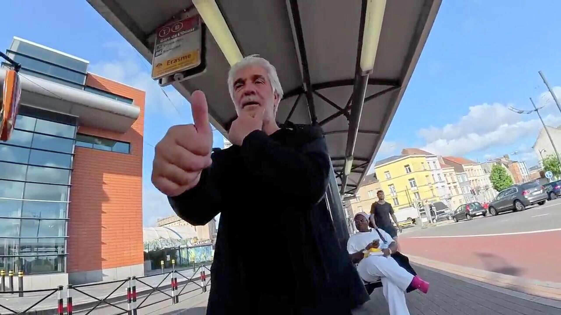 Автор видео встречает первого бездомного прямо у здания Европейского союза.