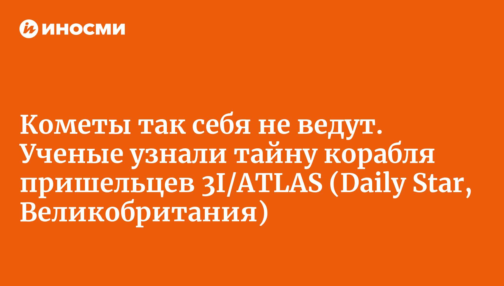 Том МакГи (Tom McGhie)Межзвездный объект 3I/ATLAS, который привлек внимание ученых по всему миру, в следующем месяце совершит максимальное сближение с Землей.ИноСМИ теперь в MAX! Подписывайтесь на главное международное >>>Профессор Гарварда выявил "двенадцать аномалий", связанных с "космическим кораблем" 3I/ATLAS, которые, по его утверждению, подтверждают "теорию об инопланетном происхождении". Межзвездный объект, успевший очаровать ученых по всему миру, готовится к самому тесному сближению с Землей в следующем месяце."Избавиться от украинского гуся": новые хотелки Киева взбесили весь мирНекоторые утверждают, что это комета, несущаяся через Солнечную систему со скоростью 209 тысяч километров в час, но профессор Ави Лёб настаивает на версии с инопланетным "космическим кораблем-базой".В своем блоге Лёб перечислил "12 аномалий", связанных с "космическим кораблем", и объяснил, почему нам следует беспокоиться об этом несущемся в нашу сторону НЛО. Ниже приведен список причин, по которым, как утверждает Лёб, НЛО не является "обычной кометой", как настаивает НАСА.Подводя итог, Лёб представил теорию о том, что за управлением 3I/ATLAS могут стоять внеземные формы жизни. Он заявил: "Суровая правда в том, что официальная наука постоянно заблуждается. Самым прагматичным подходом будет распределить риски и направить миллиарды долларов на одновременные поиски как высокоразвитых цивилизаций, так и примитивных организмов".