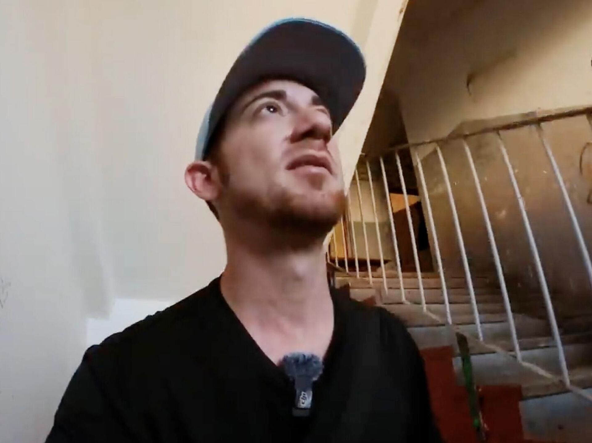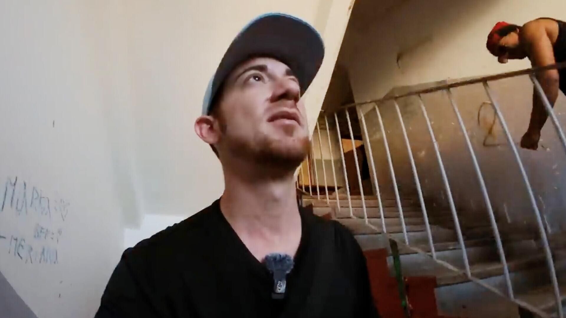 Автор ролика и его друг осматривают аварийного вида здание.